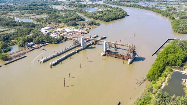 Cống kiểm soát triều Phú Định thi công đạt 71%. Hiện chủ đầu tư đang thi công tháp van, kè mang cống…