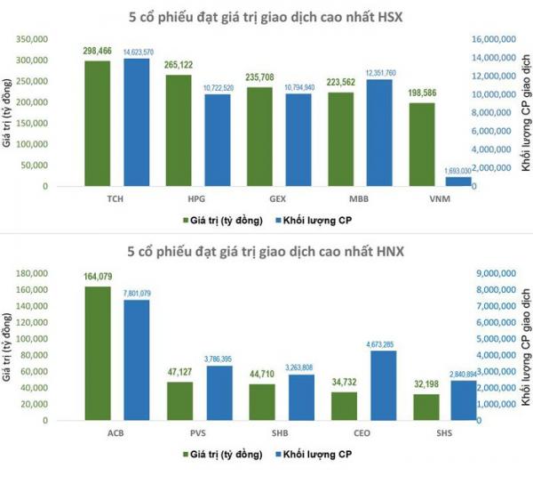 Hiện tượng phân hóa giá cổ phiếu cũng đi liền với mức gia tăng thanh khoản phiên này. Tổng giá trị giao dịch hai sàn vọt lên trên mức 8.200 tỷ đồng, tăng 11% so với hôm qua. Trong số này khoảng 1.622 tỷ đồng là giao dịch thỏa thuận.