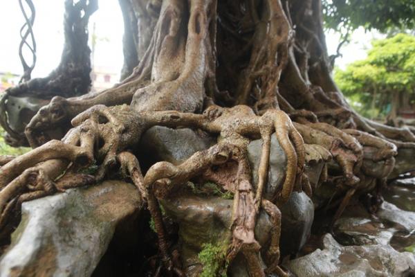 Bộ rễ cây lan tỏa xung quanh, bám vào đất, đá rất vững chãi, nhìn như những củ nhân sâm nhiều năm tuổi bám trên đá