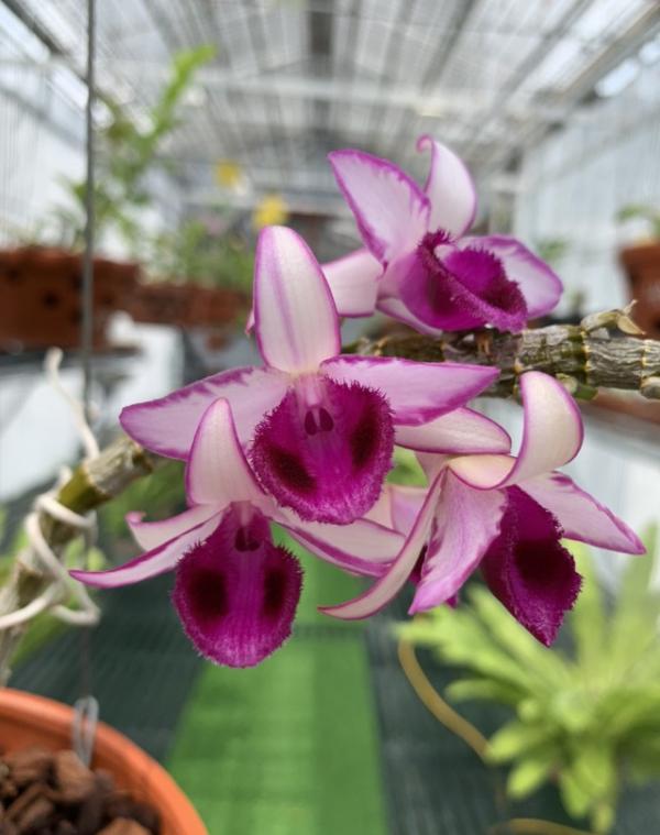 Giò lan phi điệp tím mà anh Trìu đang nắm giữ thuộc dòng đột biến gene gồm có 2 thân hoa và 3 mầm gốc. Cây có lá kẻ viền tím như vân tay, mắt đậm rõ. Lưỡi hoa tròn và có một màu đỏ như son. Không những thế, cây còn sở hữu một khuôn cánh đẹp, 3 cánh đài đều tăm tắp kèm viền tím chạy quanh và 2 cánh vai thì có chớp.