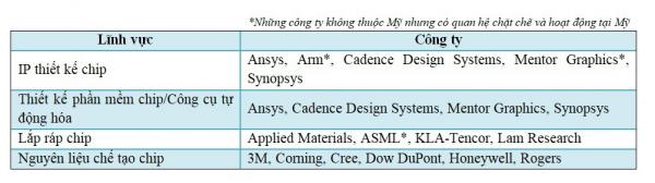 Các công ty hàng đầu trong lĩnh vực thiết kế chip đều là doanh nghiệp Mỹ. Có thể kể đến như Cadence Design Systems, Synopsys và Ansys. Mentor Graphics – nhà cung cấp công cụ thiết kế chip lớn thứ ba thế giới – Siemens (Đức) mua lại hồi năm 2016, nhưng vẫn duy trì hoạt động tại Mỹ.