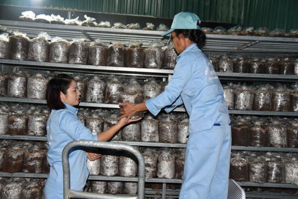 Hoạt động sản xuất nấm của HTX dịc‌h vụ nông nghiệp Hợp Giang.