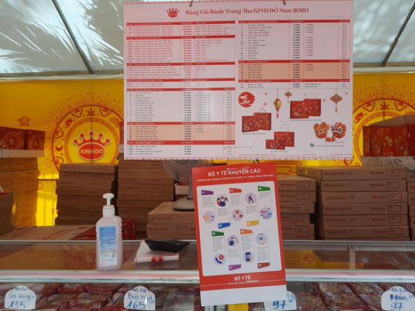 Ngoài bảng báo giá, các sạp bán bánh đều trang bị nước rửa tay kháng khuẩn và khuyến cáo khách hàng đeo khẩu trang để phòng dịch Coѵīɗ-19