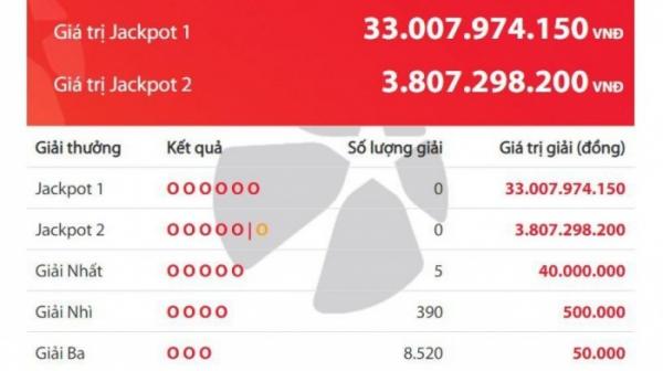 Giải Jackpot 2 trị giá hơn 3,8 tỷ đồng cũng không tìm được chủ nhân. Tuy nhiên, hội đồng mở thưởng đã tìm ra 5 giải nhất, mỗi giải trị giá 40 triệu đồng, 390 giải nhì mỗi giải trị giá 500 nghìn đồng và 8.520 giải ba mỗi giải trị giá 50 nghìn đồng.