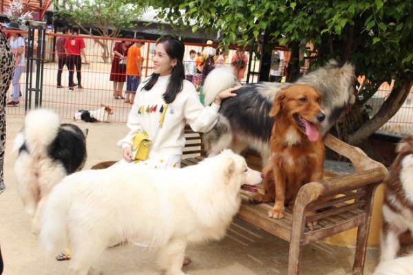 8 giờ, nông trại cún mở cửa. Du khách háo hức vào sân chơi với chó cưng. Đàn chó “hợp chủng quốc” đủ dáng, tính cách, có con nặng 50 – 70 kg, nhưng tất cả đều rất hiền lành, dễ thương.