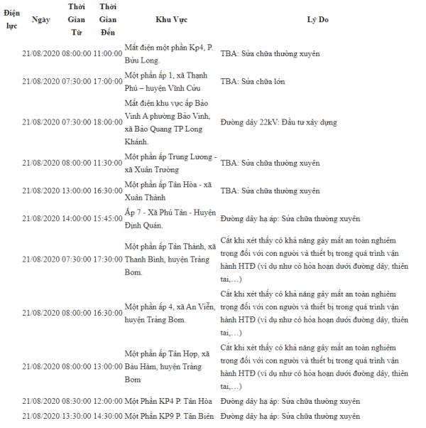 Lịch cắt điện (lịch tạm ngừng cấp điện mới nhất) cập nhật mới nhất tại các quận (thành phố Biên Hòa), huyện, thị xã (Đồng Nai) ngày mai 21/8 được Công ty Điện lực Đồng Nai thông báo như sau: