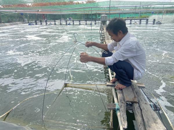 Ông Nguyễn Trường Đại, ấp Thống Nhất, xã Vĩnh Thanh, huyện Nhơn Trạch, tỉnh Đồng Nai, đang kiểm tra tôm nuôi trong ao nuôi tôm công nghệ cao của gia đình.