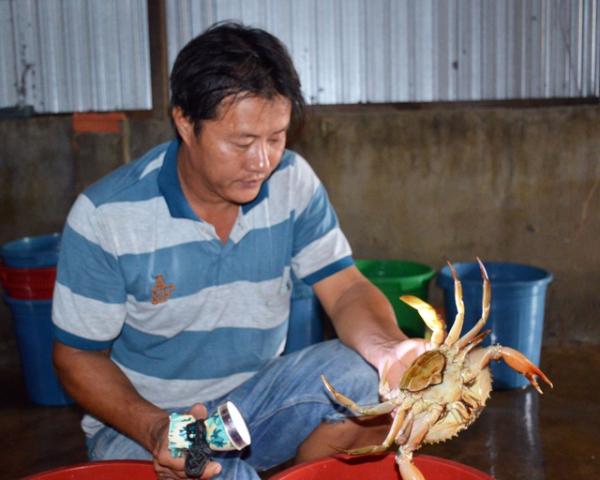 “Con cua gạch được chọn phải khỏe mạnh, có trọng lượng từ 450gram – 600gram, chất lượng gạch đạt khoảng 95% trở lên mới được”, anh Niêm nói kinh nghiệm chọn cua.