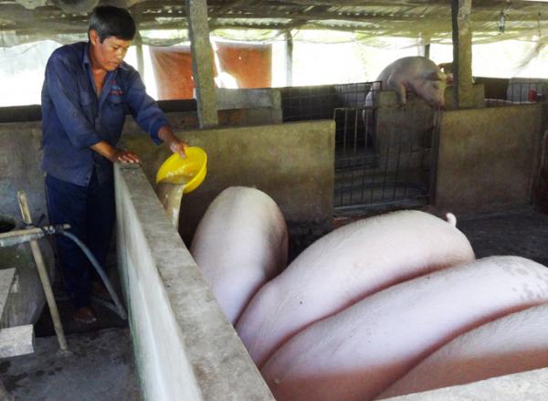 Ông Danh Hóa đang cho heo ăn. Ảnh: T.T.