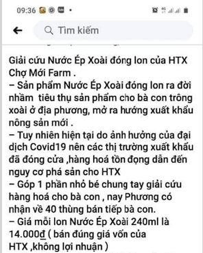 Hiện nay, trên mạng xã hội facebook, một số bạn trẻ ở TP.Cần Thơ đang kêu gọi “giải cứu” nước ép xoài đóng lon của HTX sản xuất kinh doanh dịch vụ nông nghiệp Chợ Mới.