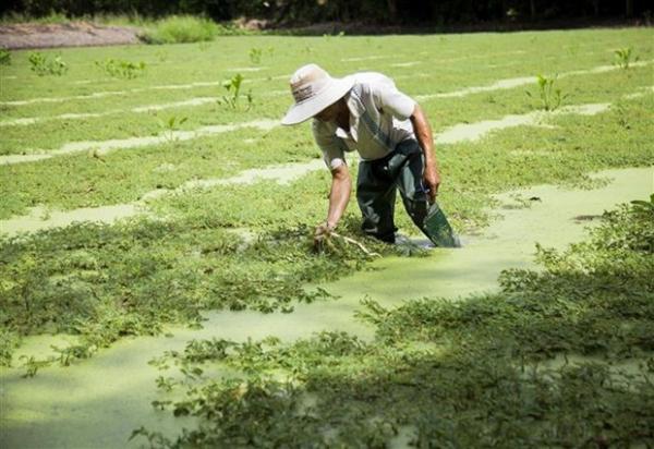 Anh Lâm Quốc Minh, xã Ngọc Chúc, huyện Giồng Riềng, tỉnh Kiên Giang thu hoạch rau nhút. Ảnh: Hồng Đạt – TTXVN