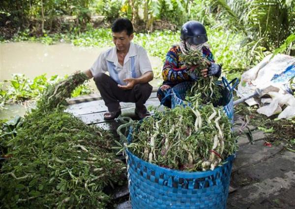 Thương lái đến xã Ngọc Chúc, huyện Giồng Riềng, tỉnh Kiên Giang thu mua rau nhút. Ảnh: Hồng Đạt – TTXVN